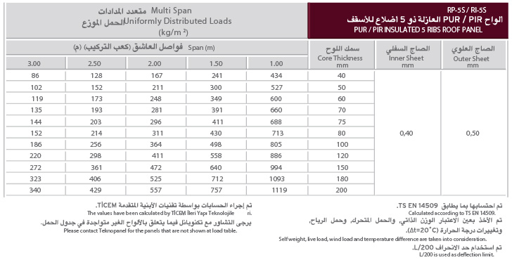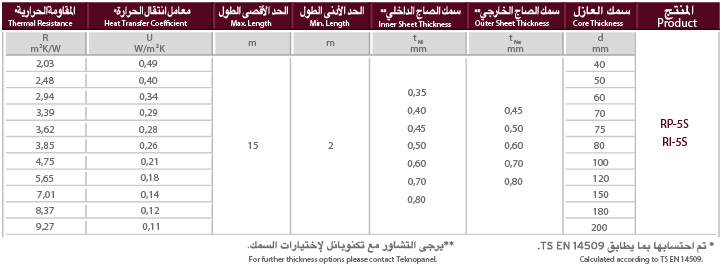 · وفقاً ل TS EN 14509, فإن معامل التوصيل الحراري U, تترواح قيمته بين 0,49 – 0,11 W/m2K وفقاً لسمك الألواح