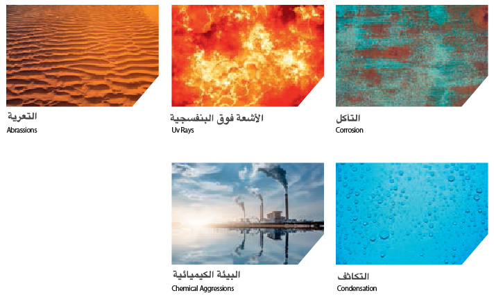 يجب أن يكون السطح الخارجي للساندوتش بانل مقاوم للتأثيرات الكميائية والفيزيائية المتعلقة بتغييرات درجة الحرارة نتيجة لتلوث الغلاف الجوي، والرياح وأشعة الشمس الفوق بنفسيجية.