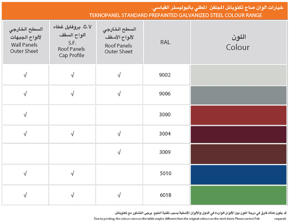 يتم استخدام جدول RAL للألوان كمرجع أثناء توضيح الألوان المستخدمة في إنتاج صاج الجلفنيز المطلي. يمكنكم رؤية ألوان الصاج المطلي بالبوليستر القياسي المستخدم في الساندوتش بانل تكنوبانل في الجدول الوراد أدناه.