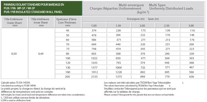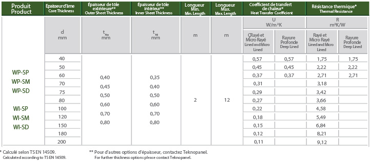 - Selon TS EN 14509, les valeurs U se situent entre 0,57 - 0,11 W/m2K selon l'épaisseur du panneau